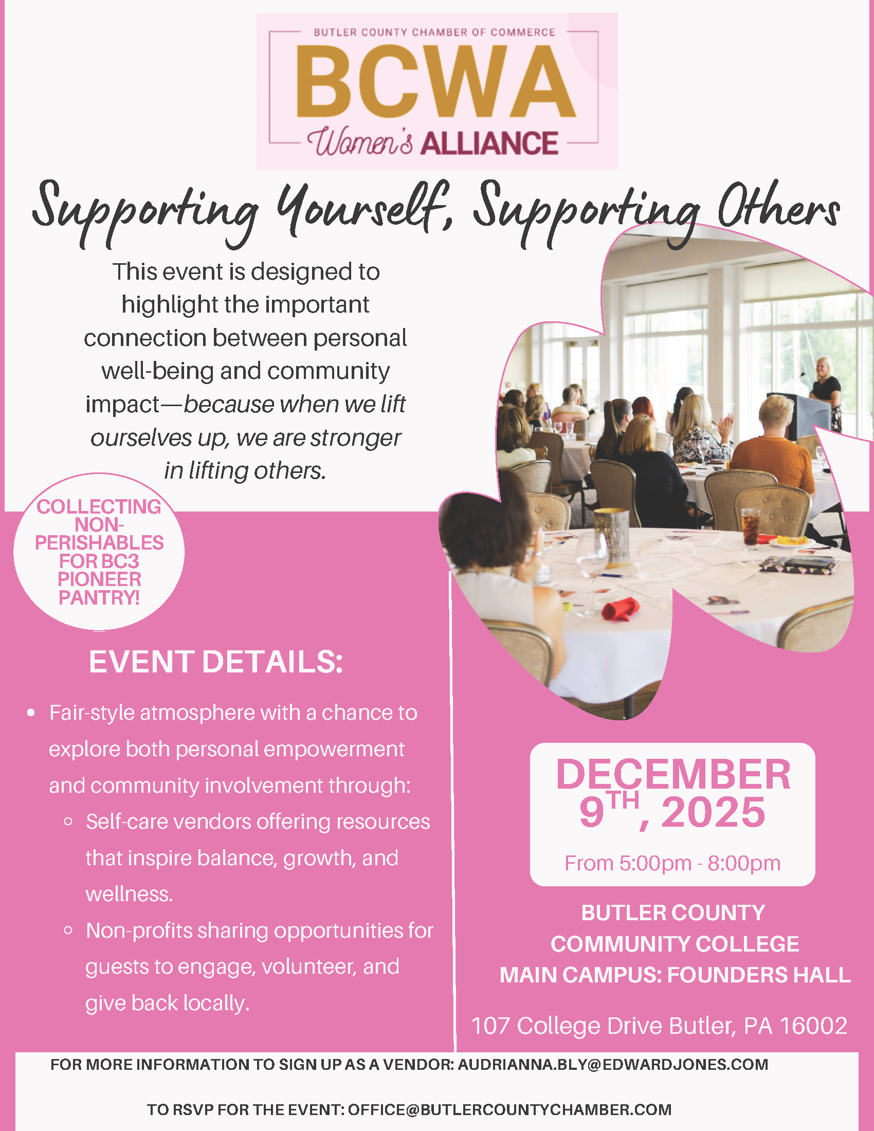 The Butler County Chamber of Commerce Women’s Alliance will host Supporting Yourself, Supporting Others on December 9. Volunteers are needed to help wellness and non-profit vendors with setup.